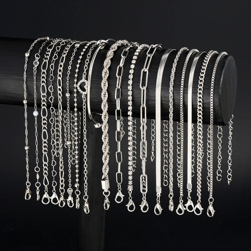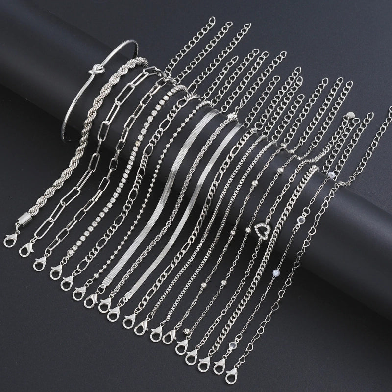 Ne choisissez plus ! Ce set de 19 bracelets argentés est la clé d'un style infini. Du bohème chic au glamour étincelant, affirmez chaque facette de votre personnalité sans effort. Chaque pièce est une invitation à briller, partout, tout le temps.